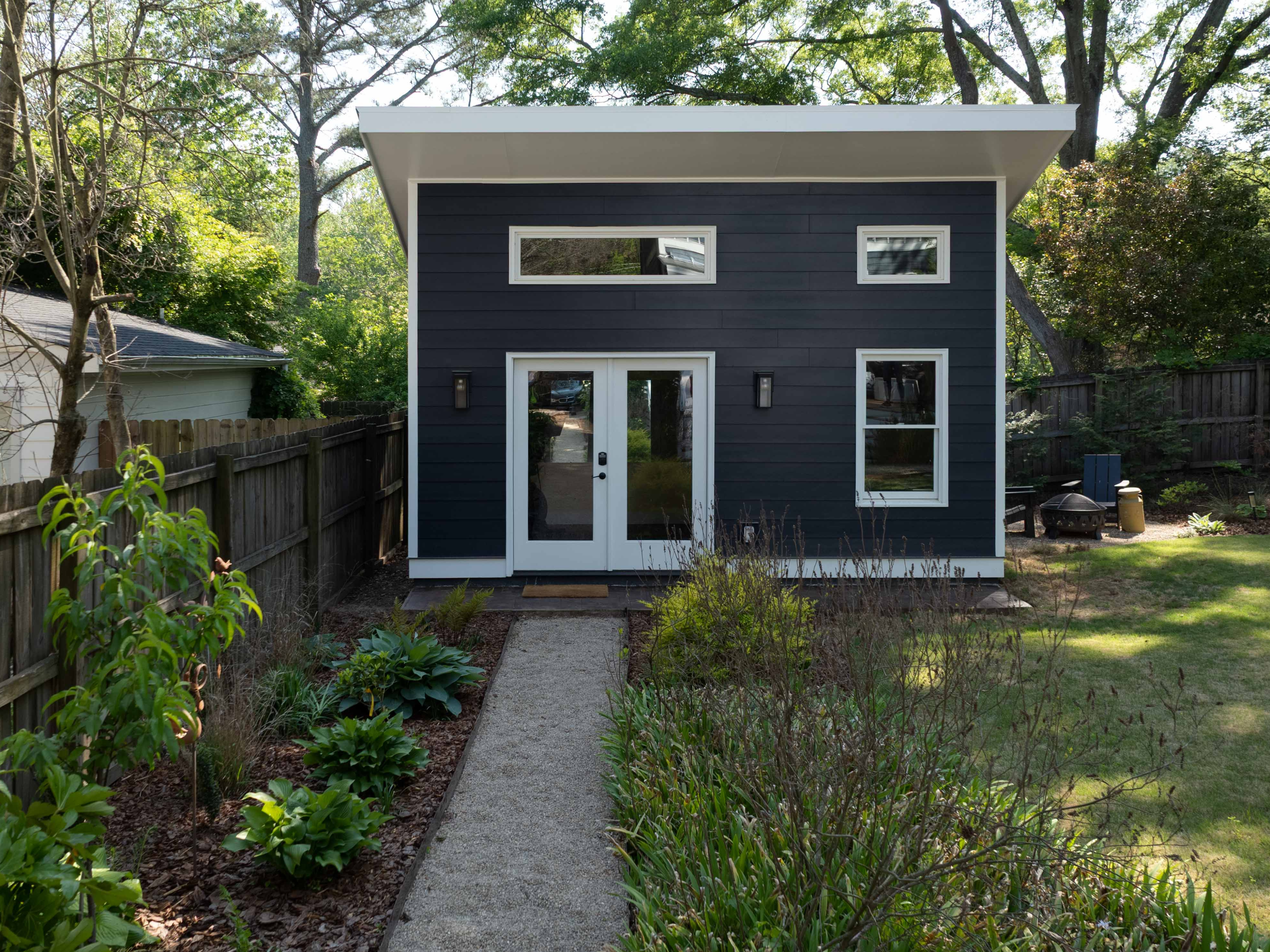 Inside, we installed drywall, trim, and four custom windows for natural light. The space stays comfortable year-round thanks to mini-split HVAC and full insulation. A stylish double door adds the final welcoming touch. Painted inside and out, this backyard addition blends function and charm—perfect for work, workouts, or relaxation.