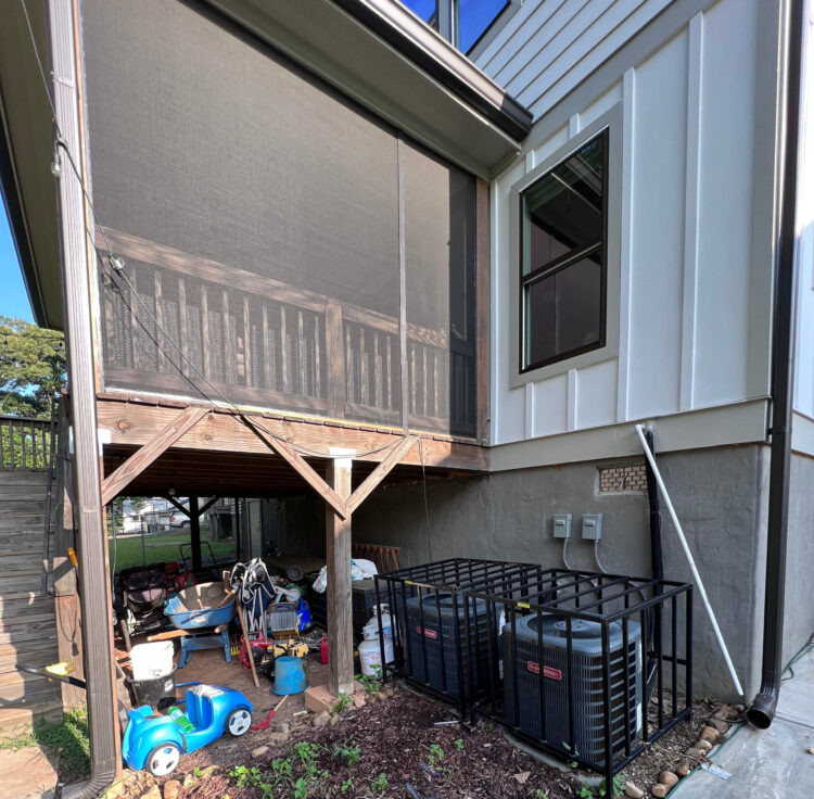 Before the remodel, this screened-in porch provided a functional but weather-exposed space. The area was used as a play zone and storage space, with limited protection from the elements. The exterior showed an elevated structure with open-air access underneath, making it susceptible to moisture and debris buildup. The overall setup lacked insulation and year-round usability.