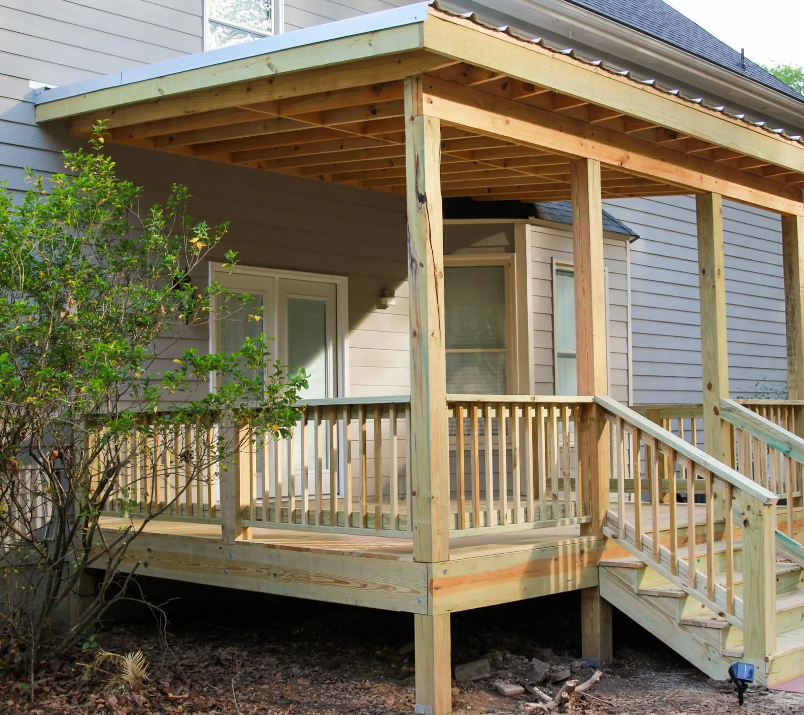 We removed the old deck and built a new, sturdy deck with pressure-treated wood. To enhance the space, we added an exposed rafter roof with durable metal roofing for lasting protection. The deck features secure railings and wide steps, providing a functional and inviting outdoor area.