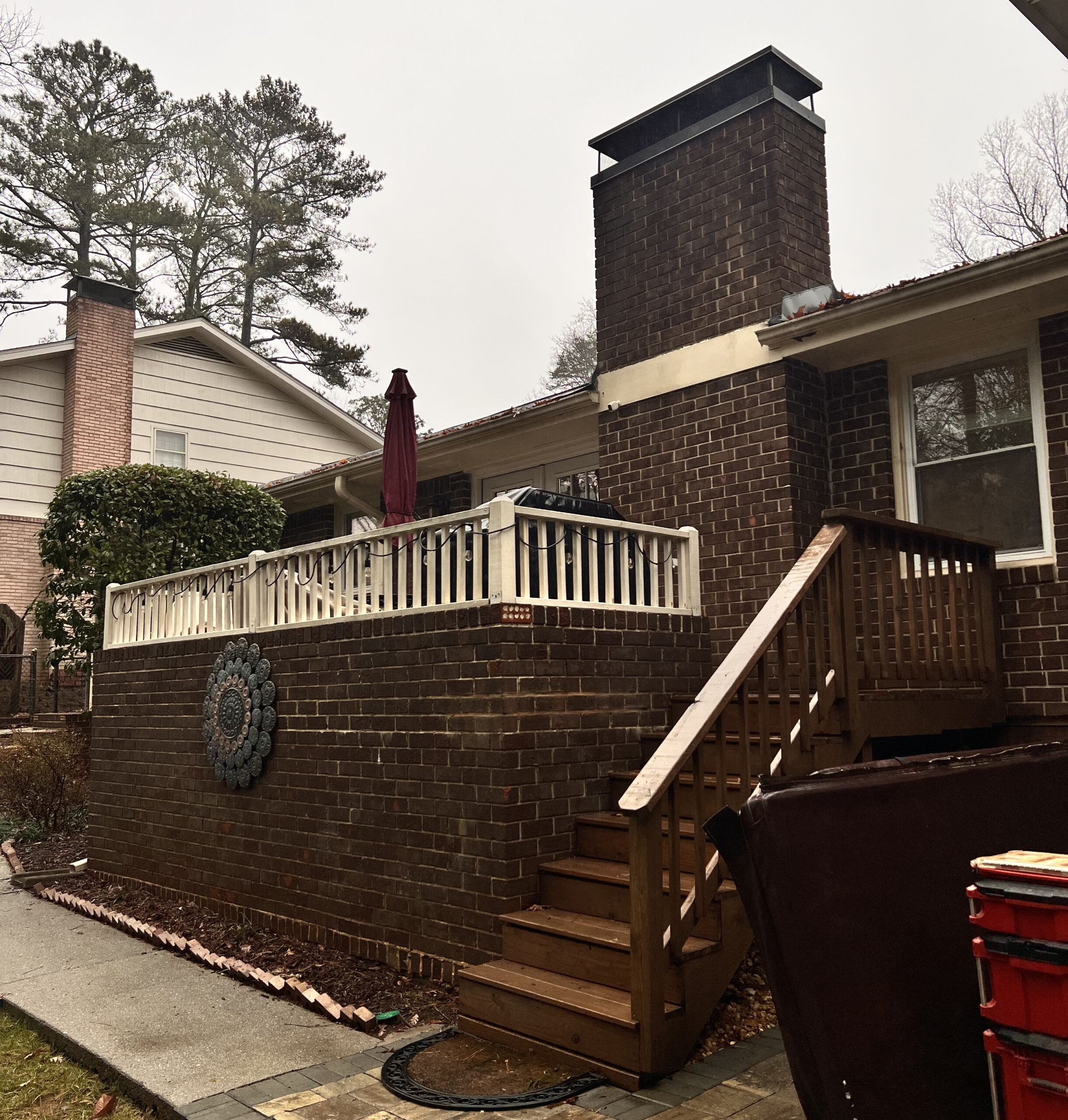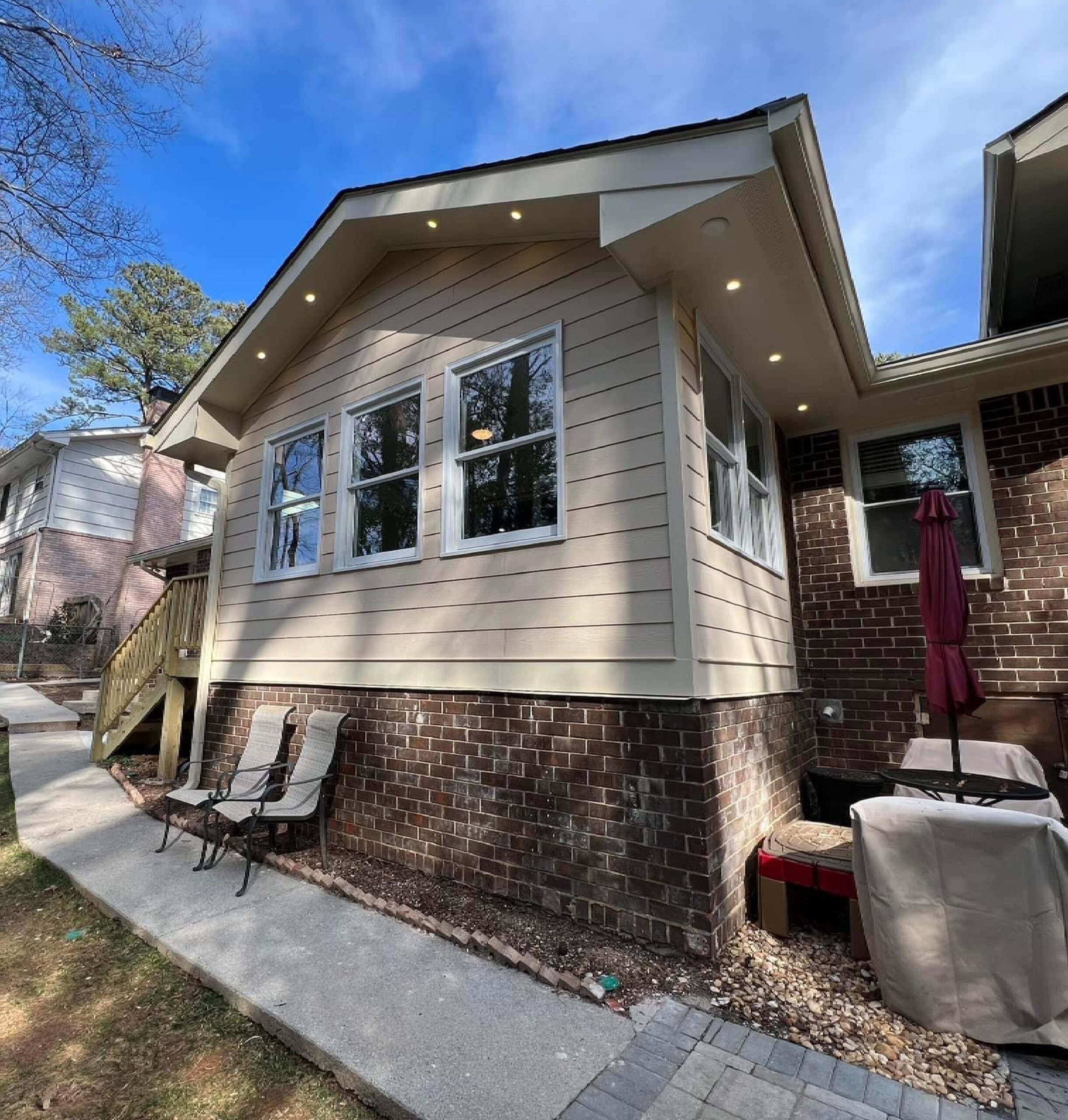 At this home, we were able to increase the homeowners useable space, by having a wall system engineered and building it on top of an existing porch. This included adding walls, roofing, ceiling, windows, doors, and moving the small entrance deck. This space is now a seamless part of the existing home.